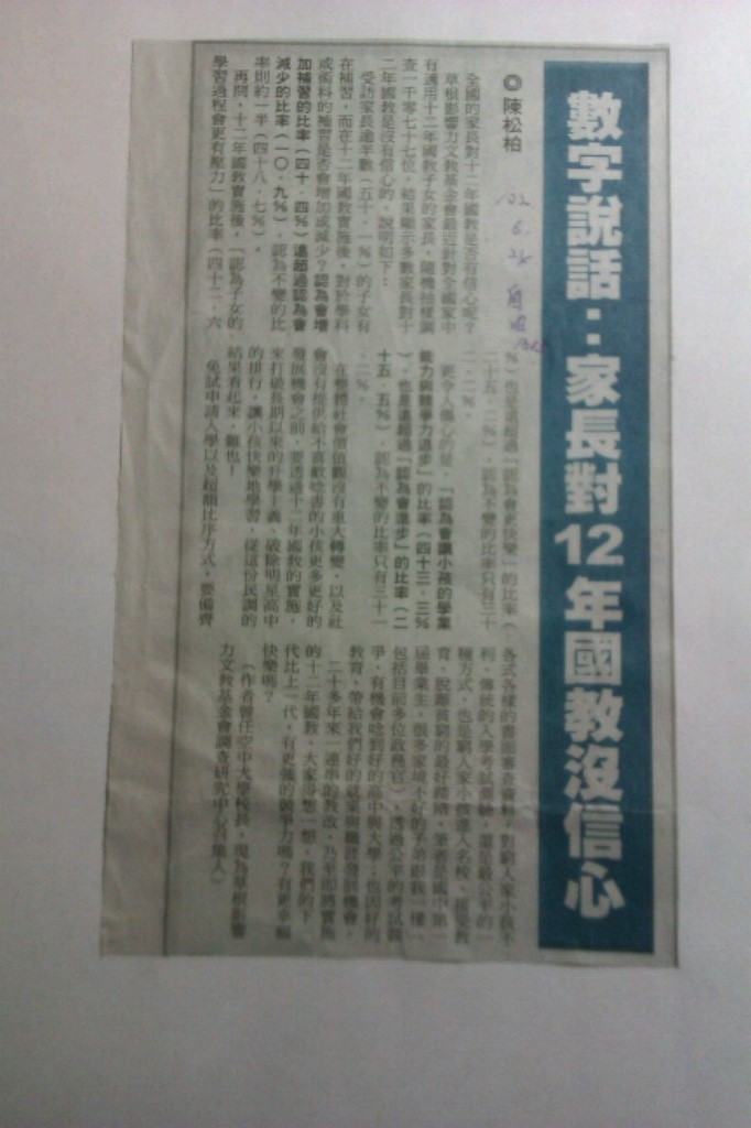 調查研究中心召集人、空中大學管理與資訊系教授陳松柏表示,十二年國教的問題是政策遲而未決,家長普遍沒有信心,甚至感受到折磨,政府應儘速拍板政策,並擴大宣傳。2013/06/20