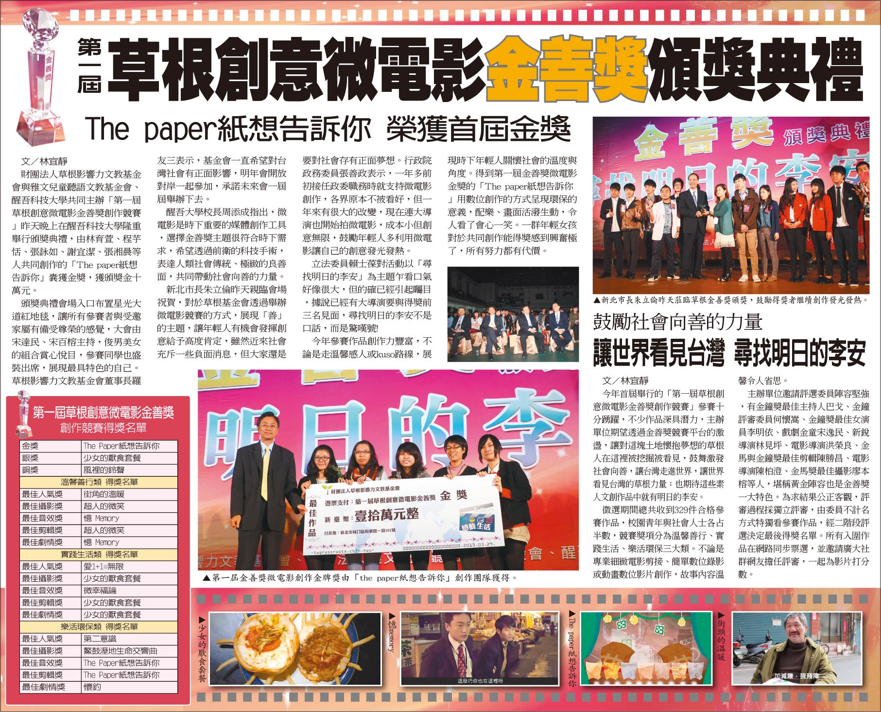 財團法人草根影響力文教基金會自101年10月1日起迄今(102)年3月29日,與雅文兒童聽語文教基金會、 醒吾科技大學共同主辦『第一屆草根創意微電影金善獎創作競賽』,藉由年輕人勵志奮發與樂於助人的生活故事,以創意微電影及活動競賽的建教合作模式,結合虛 擬與實體的廣宣平台,建立年輕人樂觀進取、敬老扶弱、關心社會的正向價值觀,以使年輕人無論在家庭、學校或社會職場,皆能發揮向上提升的正面能量。